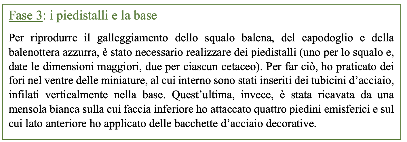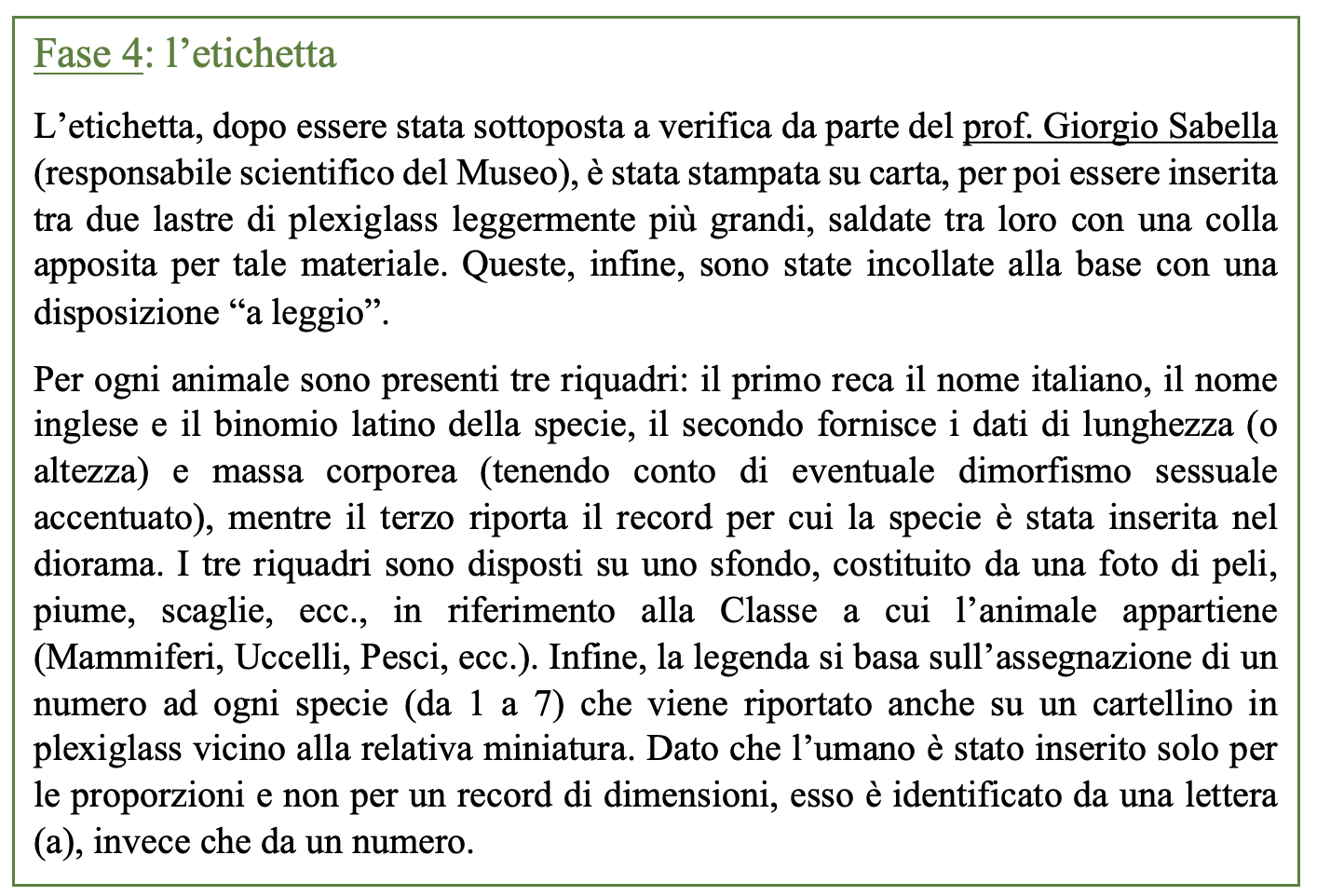 Basandomi su questa immagine complessiva, ho poi riprodotto su carta gli animali, realizzando anche il disegno in scala 1:50 (in modo da poterlo usare come riferimento durante la costruzione delle miniature). Nel progetto cartaceo, ho affiancato al disegno di ogni specie le informazioni che avrei poi riportato nell’etichetta del diorama (fatta eccezione per dieta e longevità, alla fine non inserite).